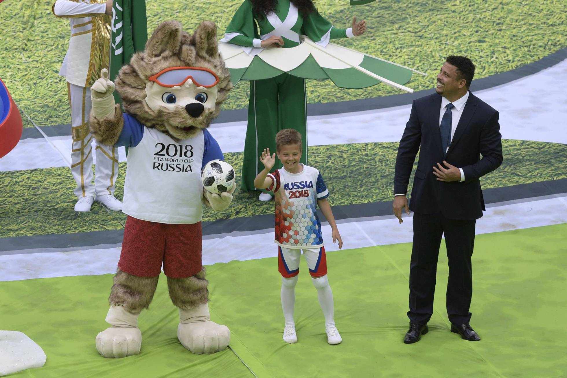 El astro brasileño Ronaldo, campeón Mundial 2002, acompañó en el simbólico saque inicial a la mascota del torneo, Zabivaka, y a un niño ruso que despertó la primera gran ovación de la jornada cuando pateó el balón hacia el lugar en el que se encontraba Zabivaka, la mascota de Rusia 2018.